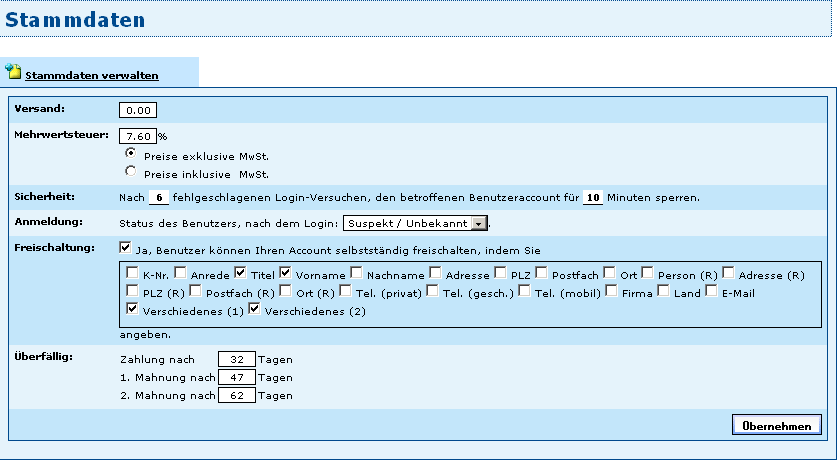 In diesem Fenster legen Sie die Stammdaten (Mehrwertsteuer,...) fest.